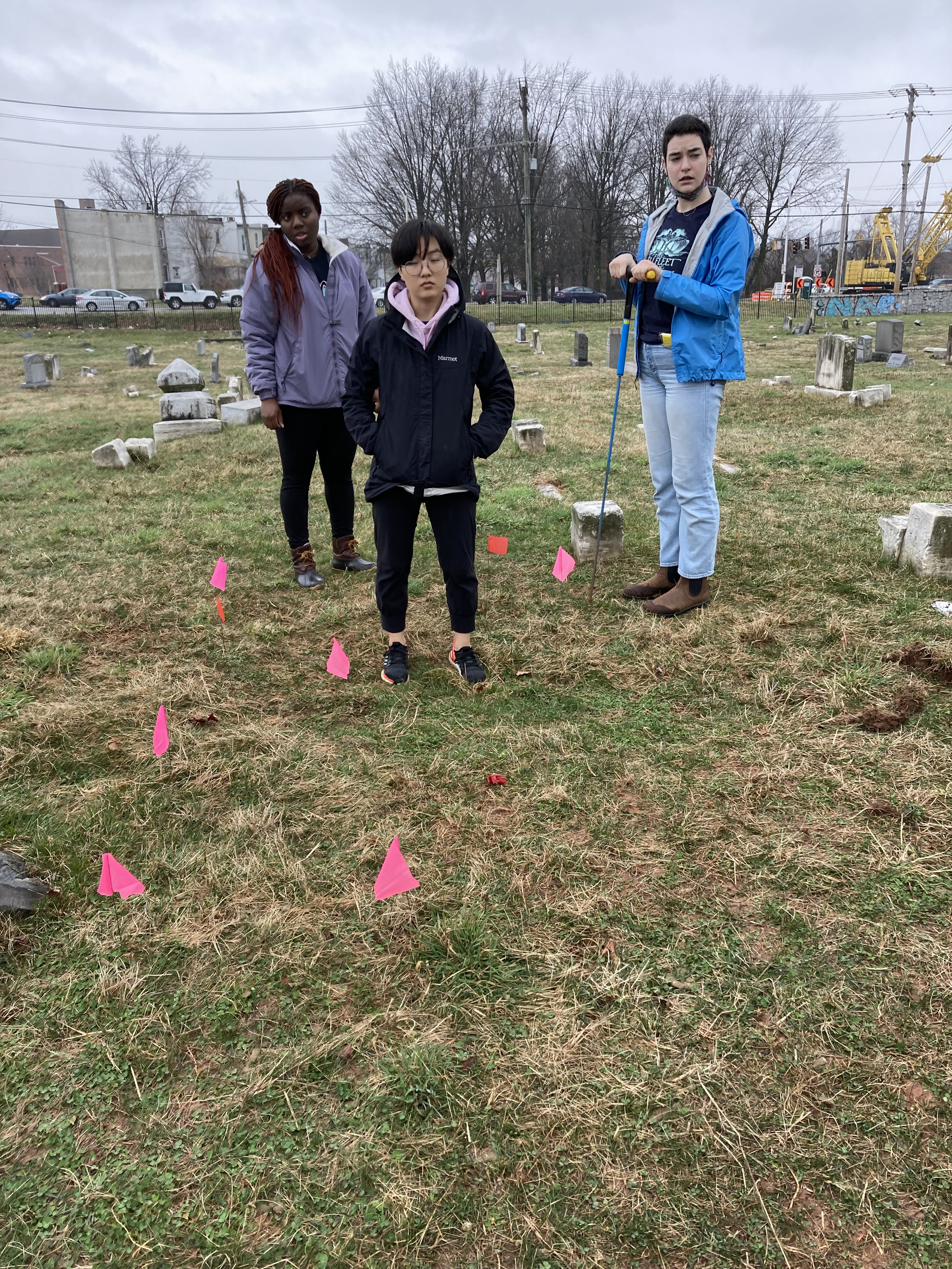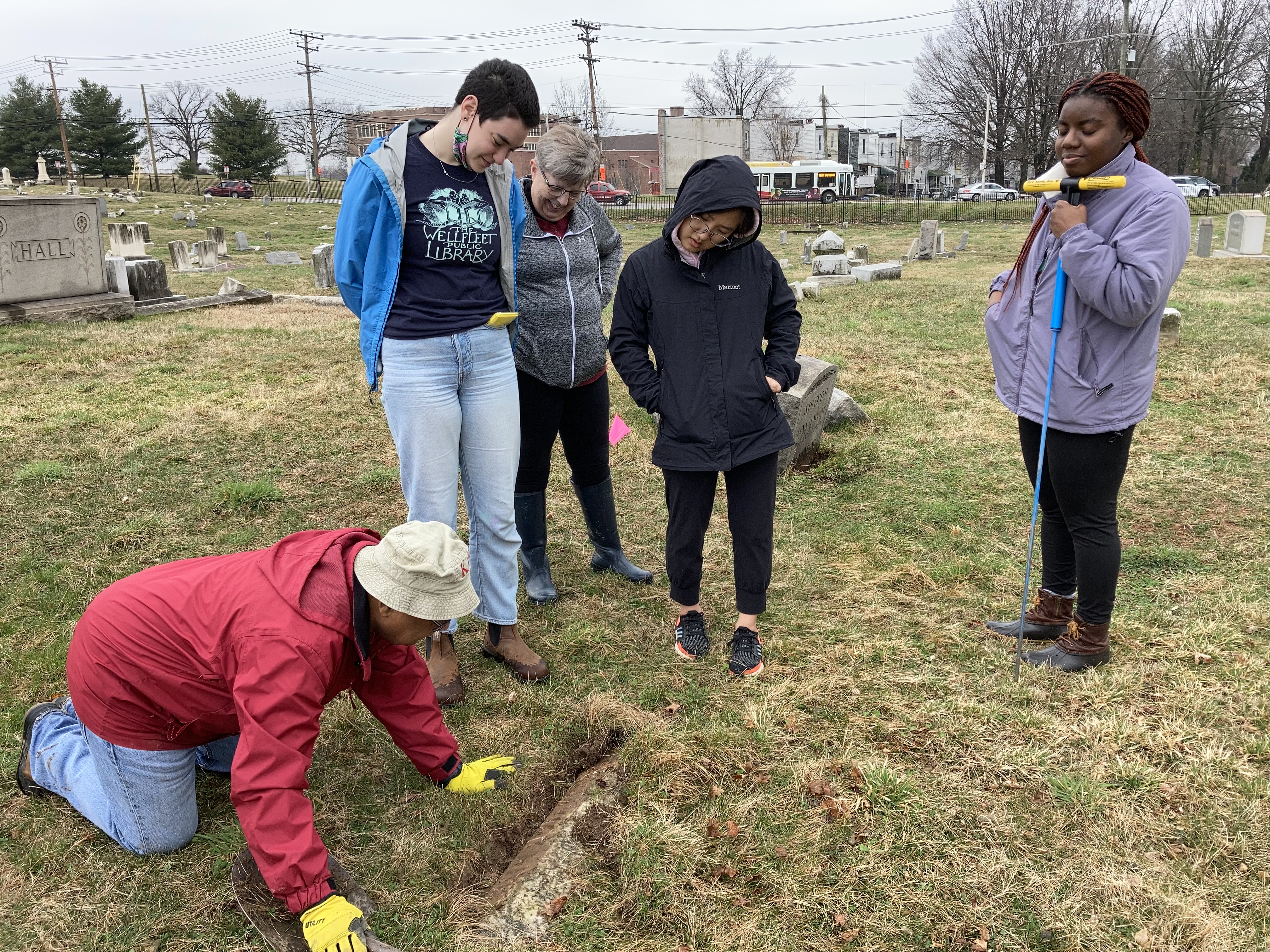 From left to right, top to bottom: Jesse Bennett, Research Coordinator for the cemetery and co-instructor of the class, gives a tour while students document via photographic and audio recording; Nancy Sheads, a volunteer researcher for the cemetery, archivist, and co-instructor of the class, discusses tombstone symbolism; students documenting gravesite data; examining a partially obscured marker for clues about the name and dates of the interred; matching grave-markers to historic plot maps; flagging an area to determine the outlines of a family plot, where the markers have been buried over time; reading a biography on a tombstone.